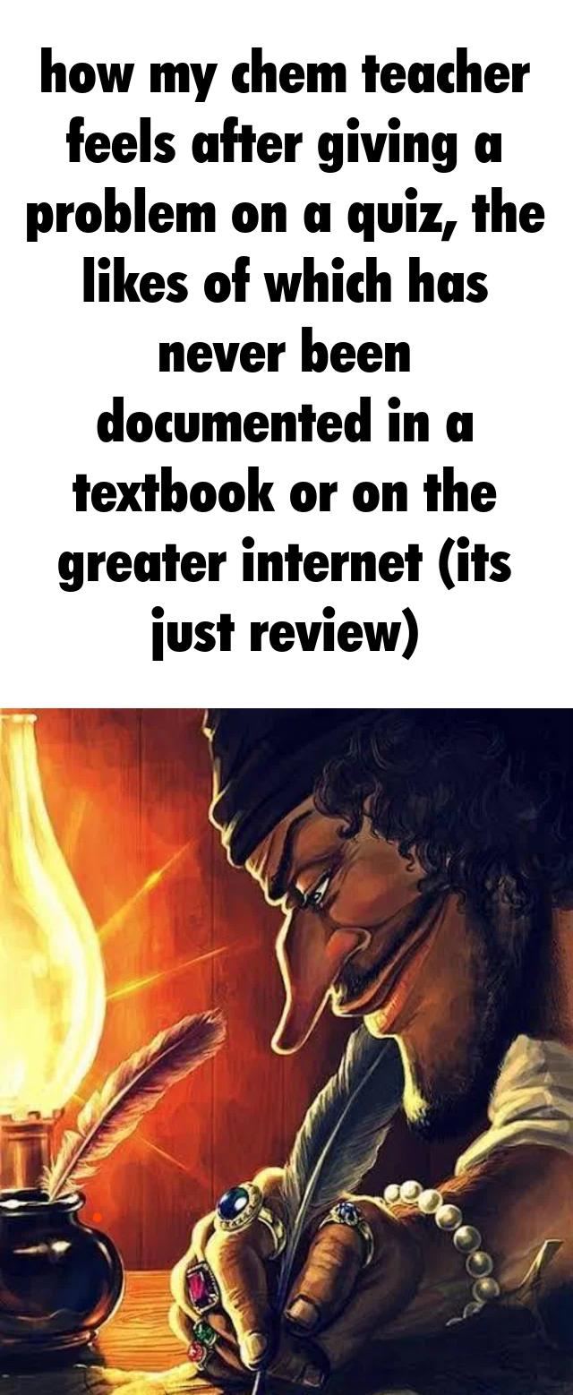 I wonder how my chem teacher feels after giving me a problem on a test we were never taught how to solve (I’ve been working for two hours on one problem and have found nothing on how to solve anything like it literally anywhere in the text book, internet, etc)