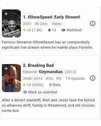 fun fact ishowspeed’s Early Stream currently has a higher score on IMDB than ozymandias